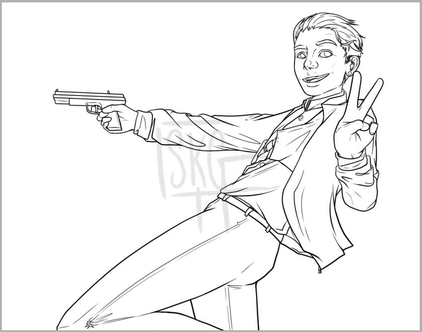 Now you might think I might have missed a step, but I go straight into rough lining out what I have planned. Normally I have a ton of reference pictures of the clothing and I used my own hoodie sleeve to ref the twist of his jacket on his arm.